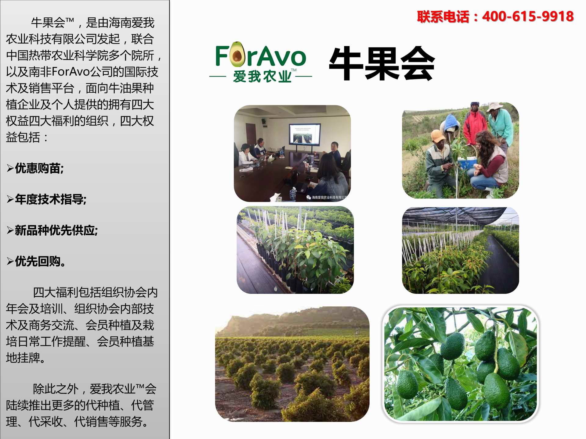 海南愛(ài)我農(nóng)業(yè)科技有限公司是一家綜合性的高科技農(nóng)業(yè)發(fā)展企業(yè),旗下愛(ài)我農(nóng)業(yè)TM致力于打造中國(guó)最大最強(qiáng)的牛油果種植企業(yè)。依托美國(guó)、南非、澳大利亞等擁有百年牛油果繁育、種植歷史以及產(chǎn)業(yè)鏈?zhǔn)袌?chǎng)的優(yōu)勢(shì),開(kāi)展牛油果種苗繁育、種植技術(shù),種植加盟、深加工等產(chǎn)業(yè)。結(jié)合中國(guó)市場(chǎng),面向廣大苗圃基地、種植農(nóng)場(chǎng)、合作加工等企業(yè),推出的適合規(guī)模化、標(biāo)準(zhǔn)化的牛油果全產(chǎn)業(yè)鏈服務(wù)。 Hainan Foravo Agricultural Technology Co., Ltd. is a comprehensive high-tech agricultural development enterprise , dedicated to building the largest and most powerful avocado plantation enterprise in China. Relying on the advantage of avocado nursery, planting history, and the industrial chain over 100 years in the United States, South Africa, Australia, we are carrying out nursery, planting, proce...